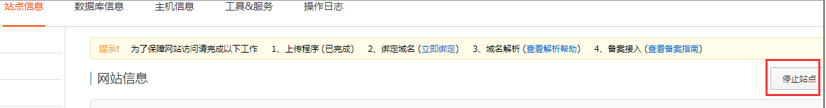 4. 如果文件无法删除,可能存在文件被占用或未释放。可以 停止站点 后,在尝试删除文件。该操作会暂停站点服务,请勿在业务高峰期执行此操作。