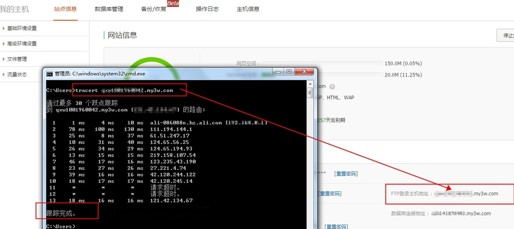 请不要使用IP地址连接FTP,如果您使用的虚拟主机,由于IP地址共享有可能无法连接到FTP,推荐您使用域名作为 FTP 连接地址,如图: