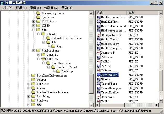 2. 打开本地工作站的系统注册表编辑界面。展开 HKEY_LOCAL_MACHINE 注册表分支,从其后弹出的分支列表中依次选中 SYSTEM > CurrentControlSet > Control > Terminal Server > Wds > rdpwd >Tds > tcp 子键。